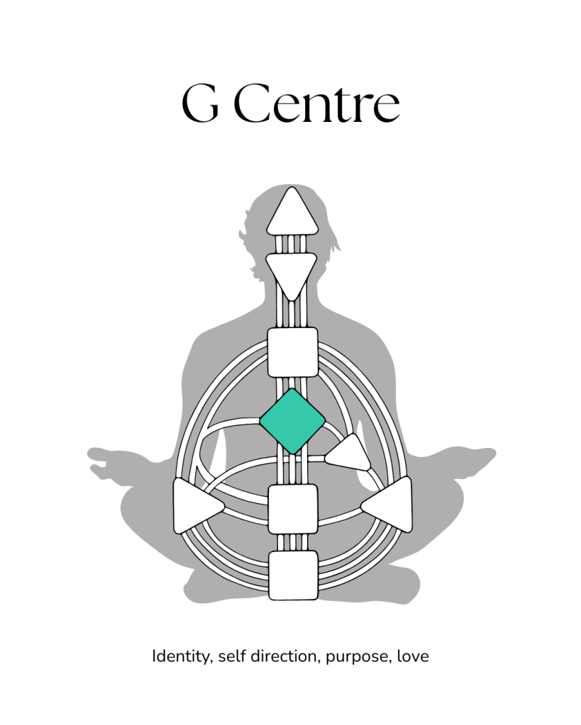 The G centre sits right in the middle of the Human Design bodygraph as a diamond. And is the centre that holds energy for identity, self direction, purpose and self love.